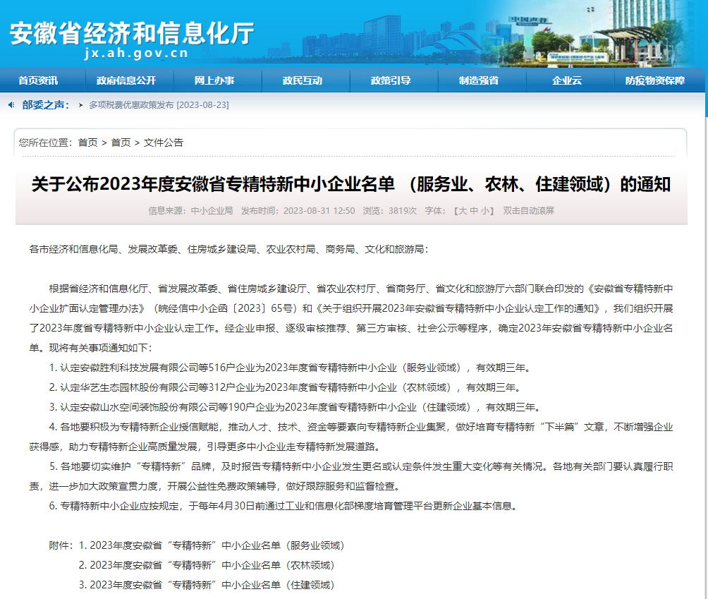 根據(jù)省經(jīng)濟(jì)和信息化廳、省發(fā)展改革委、省住房城鄉(xiāng)建設(shè)廳、省農(nóng)業(yè)農(nóng)村廳、省商務(wù)廳、省文化和旅游廳六部門聯(lián)合印發(fā)的《安徽省專精特新中小企業(yè)擴(kuò)面認(rèn)定管理辦法》(皖經(jīng)信中小企函〔2023〕65號)...